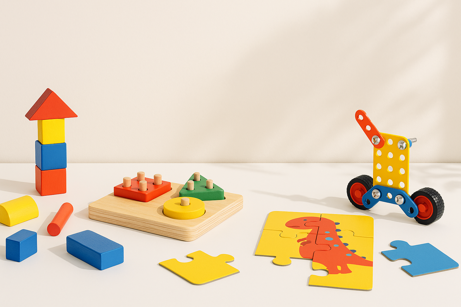 “Realistic, modern banner featuring children’s toys in a bright, lively setting. Include colorful building blocks, plush toys, and interactive playsets arranged naturally. Soft, natural lighting with a clean, contemporary background. Focus on high-quality textures and realistic shadows, with space for overlay text. Trendy, cheerful, and appealing for today’s online toy shoppers.” in 300x100 pixels